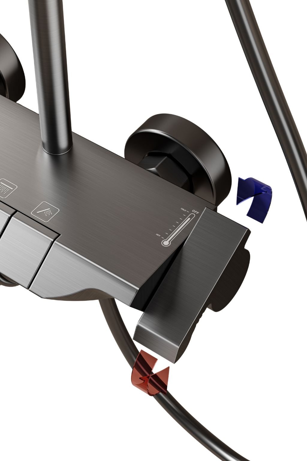 Zestaw obejmuje baterię z termostatem, kolumnę prysznicową, szeroką deszczownicę oraz słuchawkę prysznicową, a także dodatkową wylewkę kaskadową oraz natrysk ręczny. Dzięki temu model pełni funkcję kompletu 4-w-1, dopasowanego do różnorodnych potrzeb domowników.