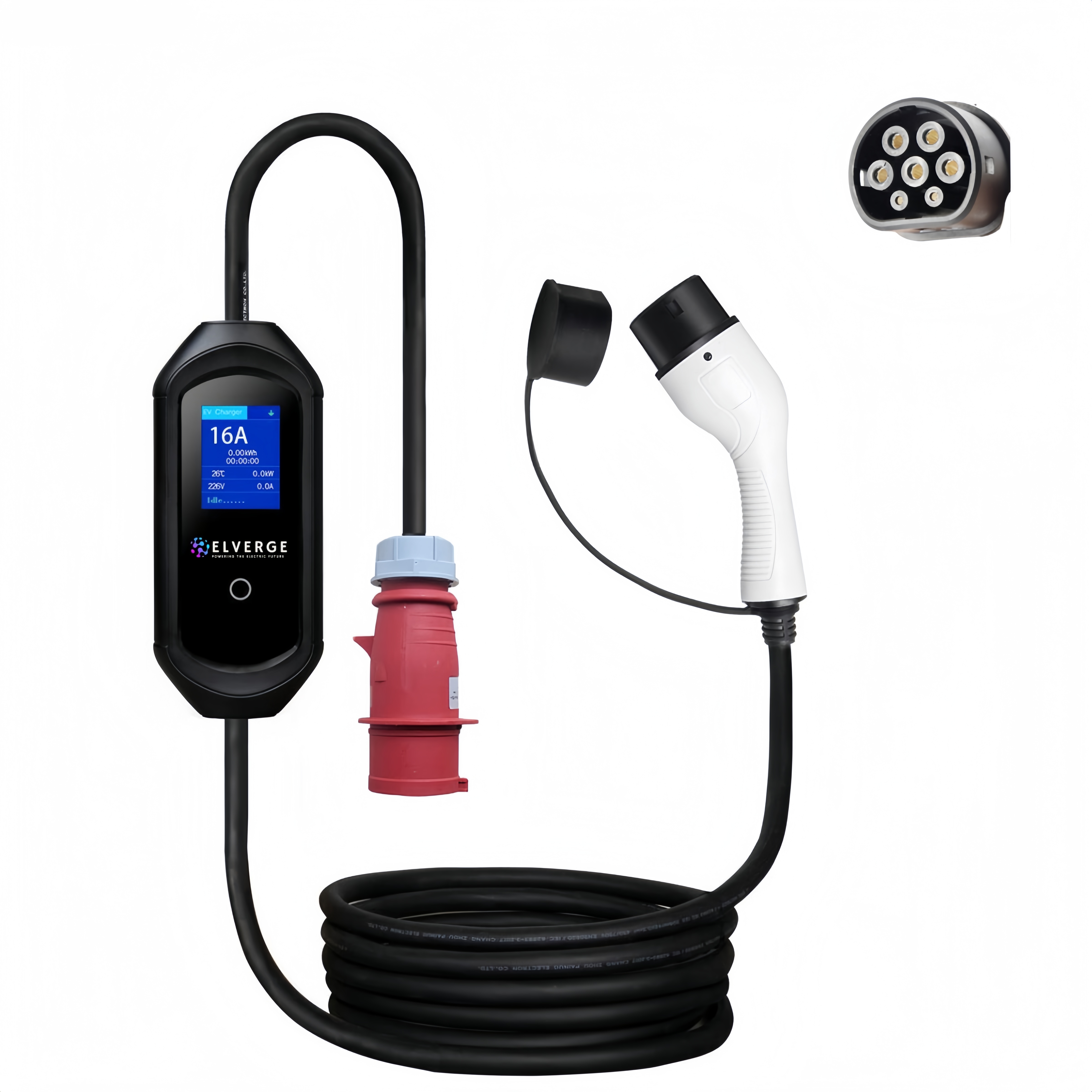 Przenośna ładowarka do samochodów elektrycznych 11 kW marki ELVERGE to wydajne i bezpieczne rozwiązanie do ładowania aut elektrycznych (BEV) oraz hybryd plug-in (PHEV) w domu lub firmie. Urządzenie obsługuje ładowanie trójfazowe 400 V (CEE 16A, tzw. siła) i pozwala osiągnąć moc do 11 kW.
